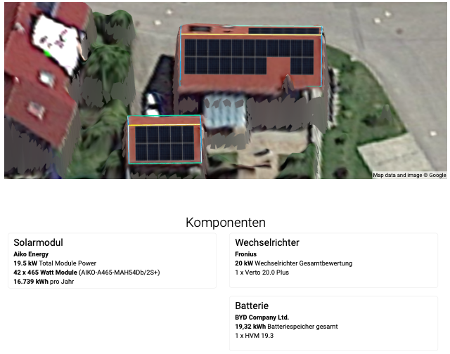 - PV‑Leistung: ca. 19,5 kWp (Dachflächen weitgehend ausgenutzt)